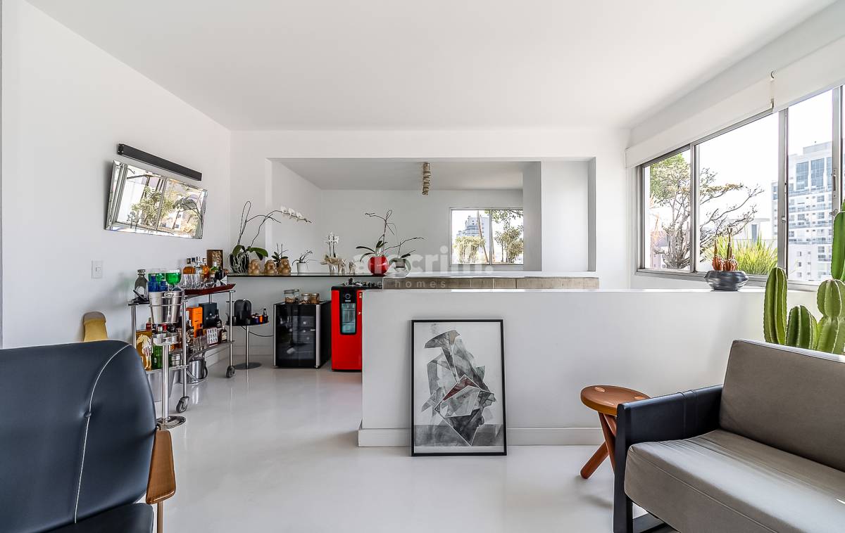 Cobertura duplex linda em prédio assinado por Ruy Ohtake em Moema PássarosA área social com pé-direito duplo conecta os dois andares da cobertura. O living super aconchegante, conta com lareira e uma varanda encantadora.