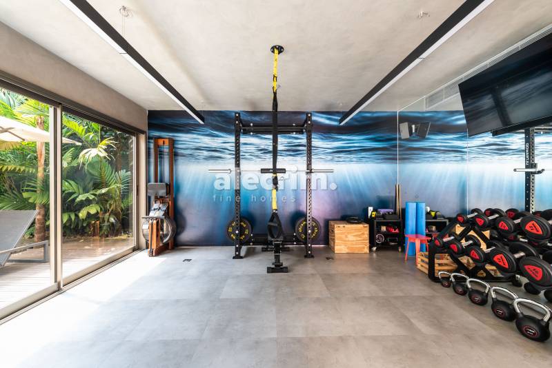 Com 520m², o pavimento superior conta com 3 suítes, cozinha com painel para abertura total para sala, sala de jantar para 8 pessoas, ampla sala de estar com bar, jardim frontal com pergolado, mesa de almoço para 6 pessoas e churrasqueira, jardim dos fundos com piscina/spa e ampla academia com banheiro.