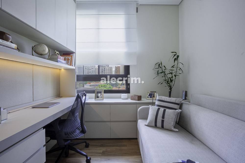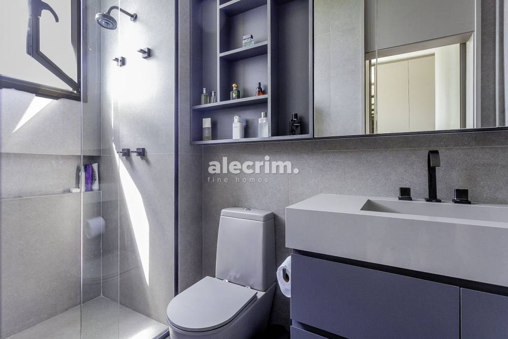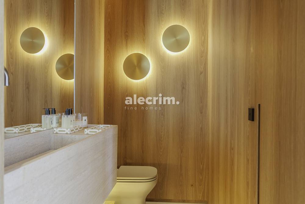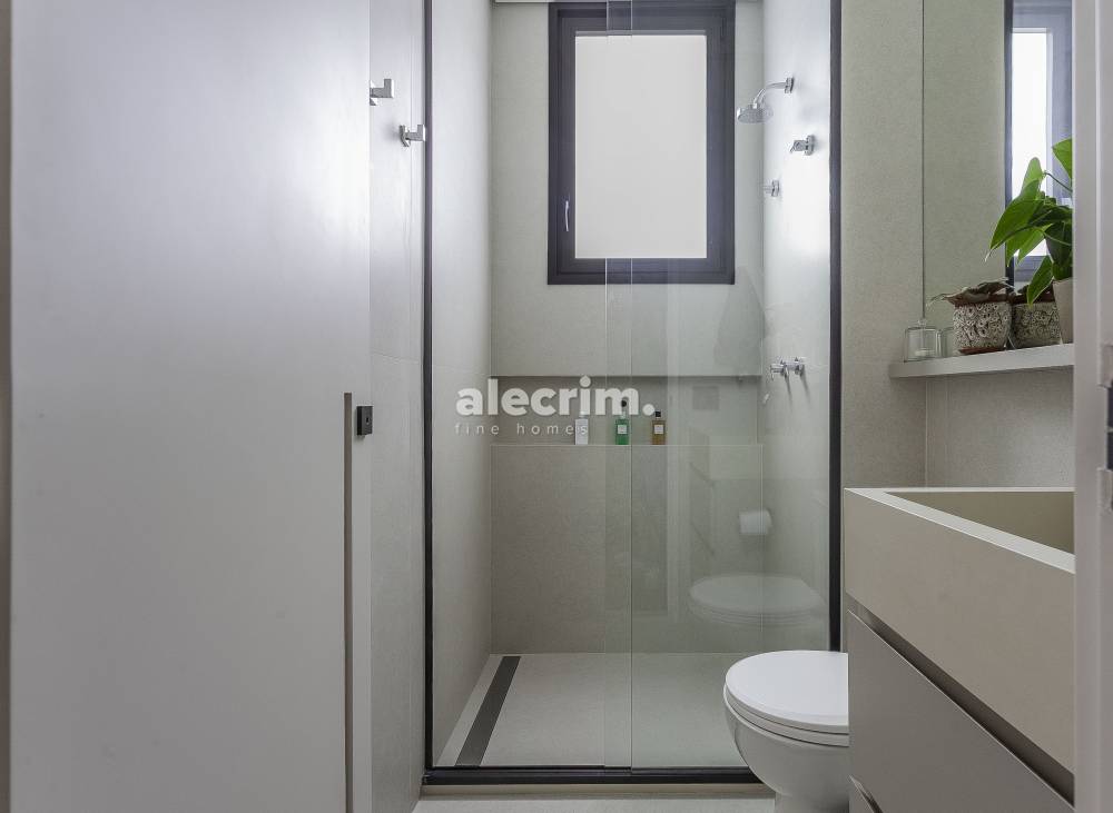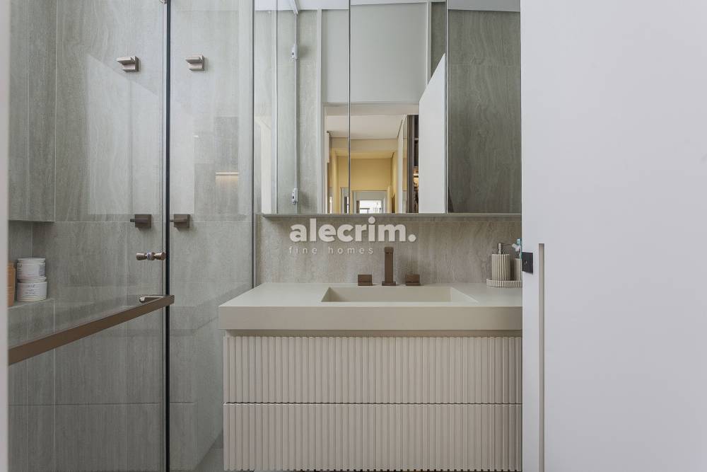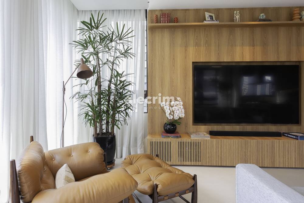 Os acabamentos reforçam o alto padrão do imóvel: revestimentos Portobello, louças e metais Deca primeira linha, cortinas e venezianas automatizadas e projeto luminotécnico com peças Interlight e Lumini, criando cenas de luz equilibradas e sofisticadas.
