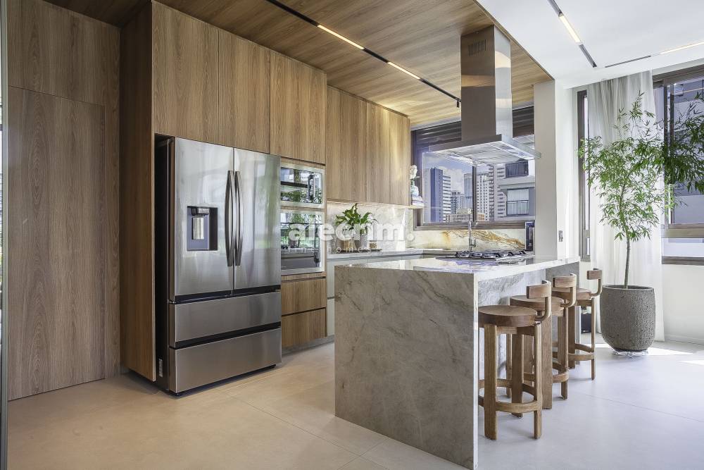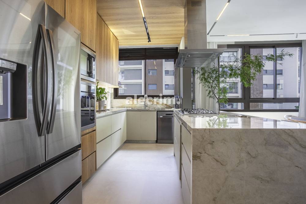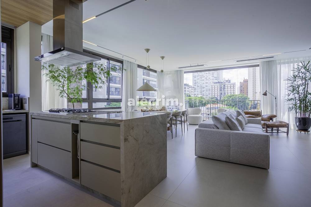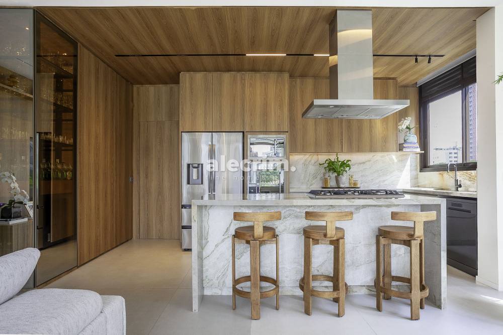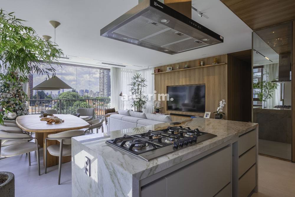 A cozinha integrada ao living é um dos pontos altos do apartamento, favorecendo a convivência, fluxos e amplitude do espaço.